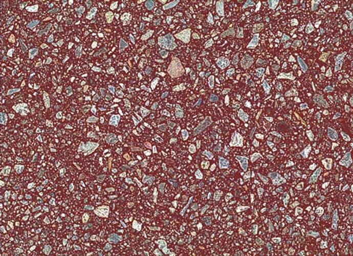 Entdecken Sie den lebhaften Charme von BituTerrazzo® "Rubin", einer Kombination aus rot pigmentiertem Gussasphalt und hellen Gesteinssplittern, die Wärme und Dynamik ausstrahlt.
